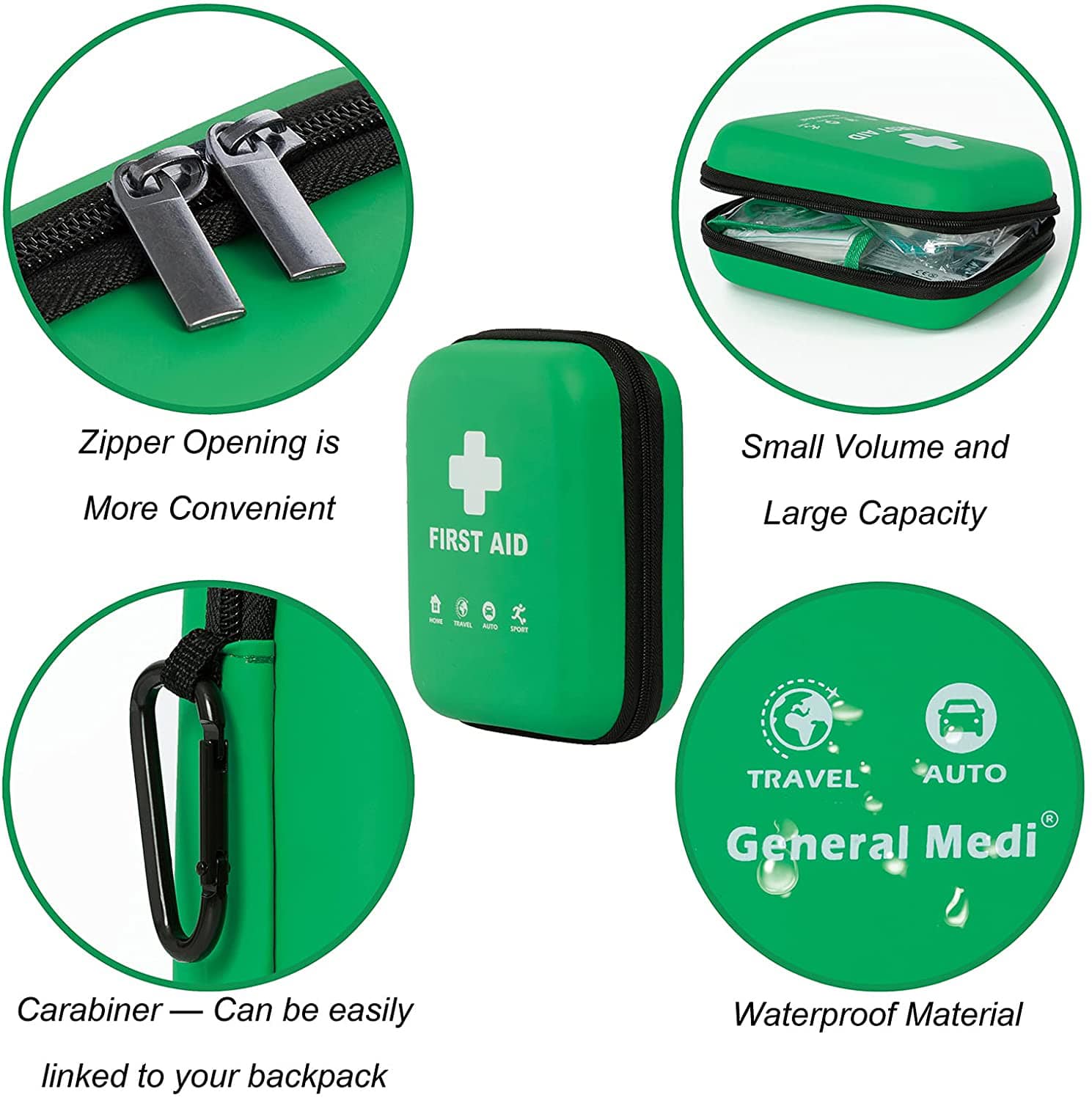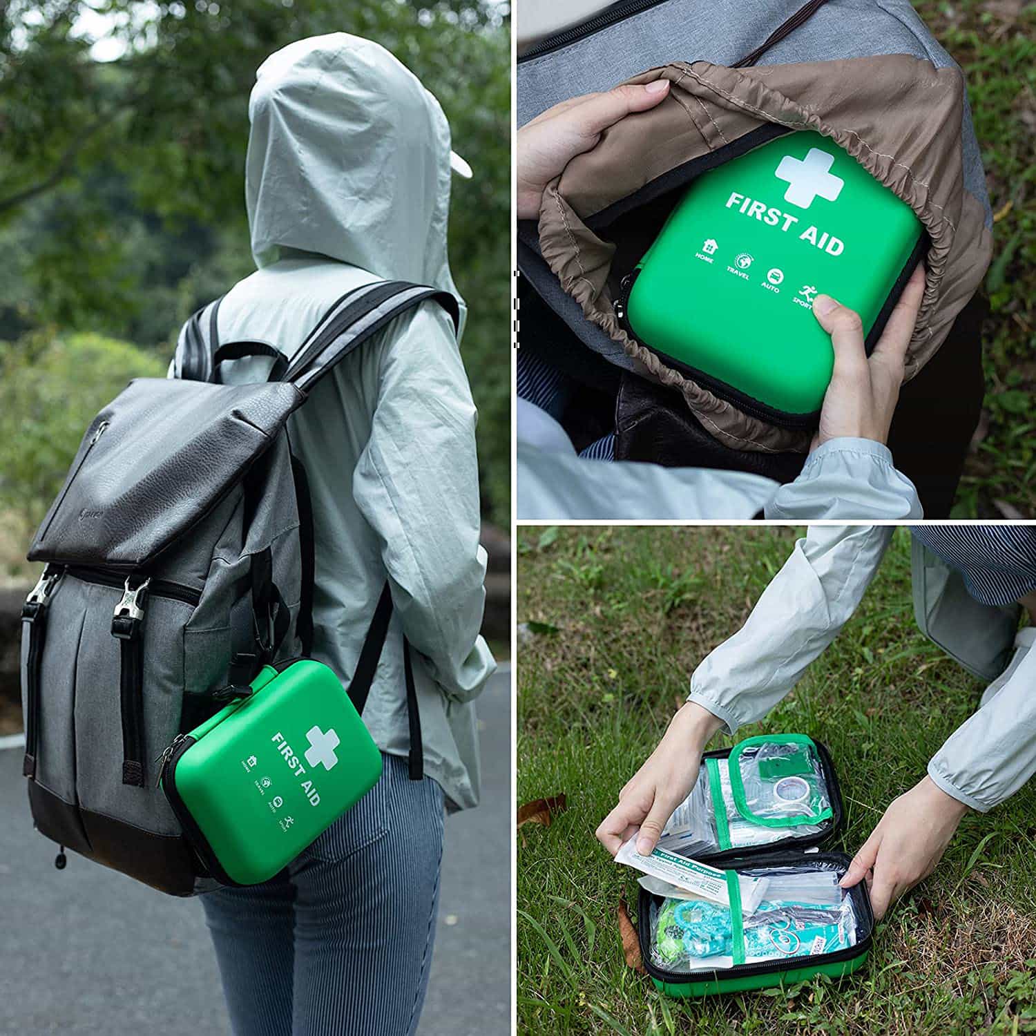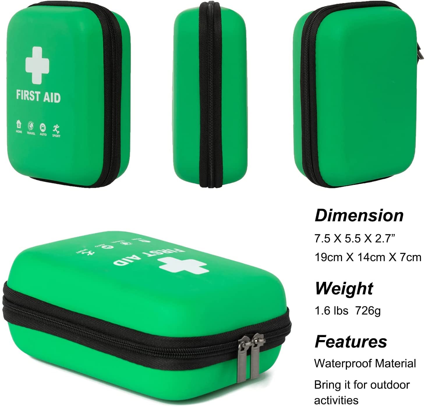 Uwendung vum Green Hard EVA Éischt Hëllef Kit: Equipéiert Äert Heem, Bürosauto, Campingberäich a méi mat dësem Deluxe Éischt Hëllef Kit.